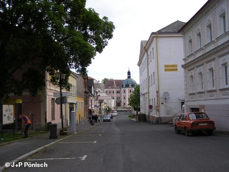 Wir rollen nun unterhalb des Schlosses entlang und erreichen am Ortsausgang die Europastraße, in die wir nach links in Richtung Karlový Vary einbiegen.