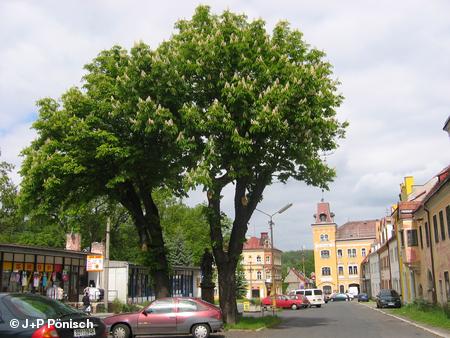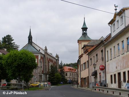 Wir fahren geradeaus weiter. Nach dem Turm am Ortsende wählen wir die linke Straße ins Tal. Kurz nach dem Bahnhof steigt diese an. Wir folgen nun der Ausschilderung nach Chodov, passieren Nové Sedlo und gelangen anschließend nach