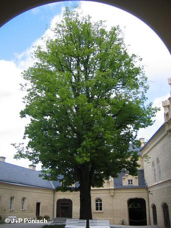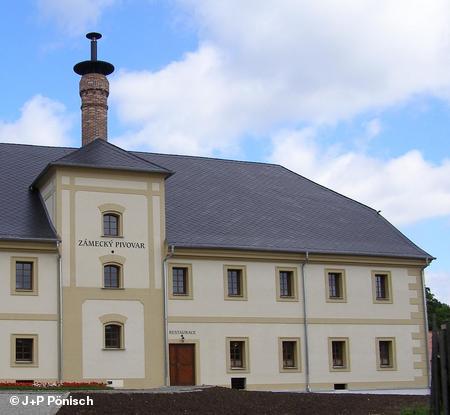 Nach weiteren vier Kilometern ist der Anstieg überwunden, wir rollen hinab nach Bečov. Etwa einen Kilometer vor dem Ort finden wir rechts den Campingplatz. Kurz nach dem Verlassen des Waldes biegen wir links in die kleine Straße zum Schloss (Zámek) ab. An der nächsten Kreuzung halten wir uns rechts und erreichen das