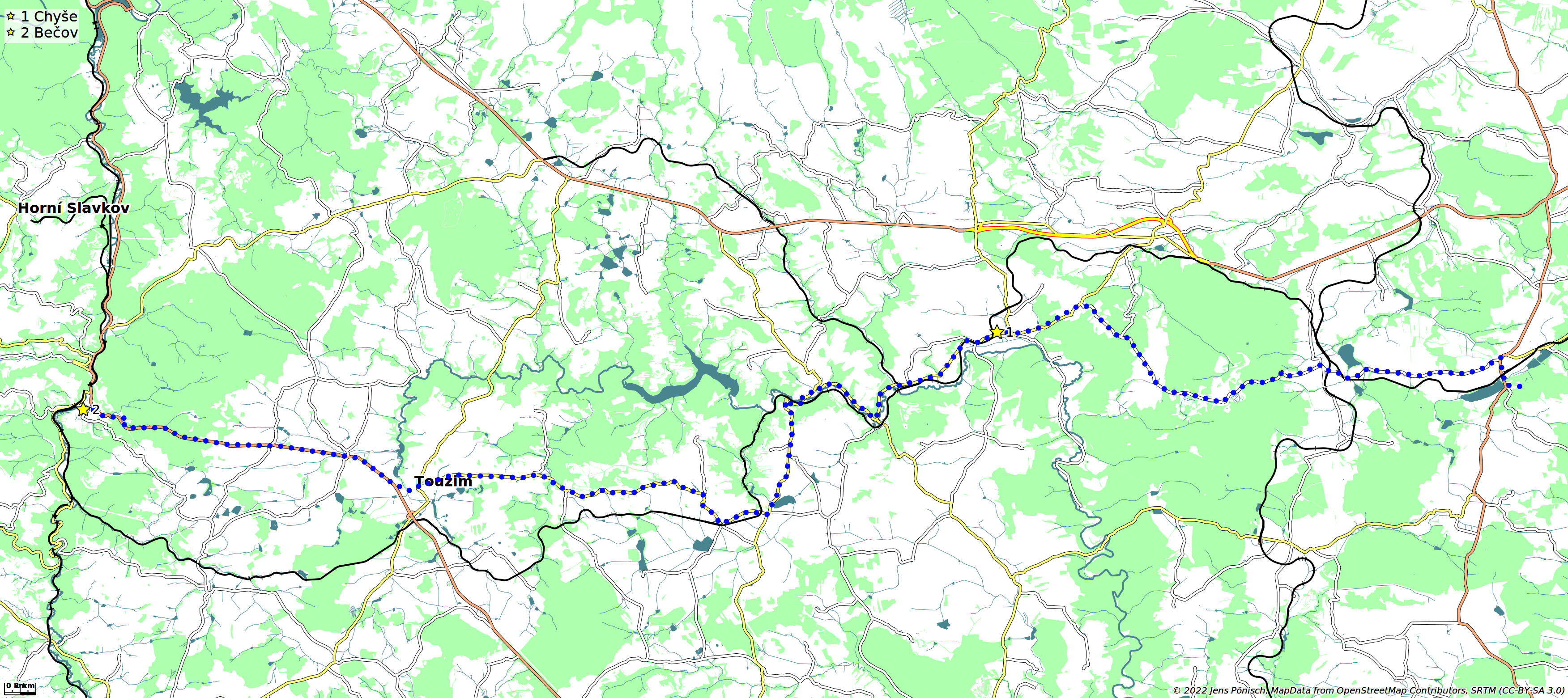 Wir fahren zurück in den Ort Jesenice und biegen vor der Kirche links nach Blatno/Krty ab. Bis Blatno (7,9 km) geht es relativ eben dahin. Hier biegen wir links nach Tis ab und haben ca. 200 Höhenmeter zu überwinden, bis wir Tis (11,4 km) erreichen. Nun wird die Strecke wieder flacher, wir passieren Kračín. Zwei Kilometer später erreichen wir im Wald einen Abzweig, an dem wir geradeaus in Richtung Chyše fahren. Nach einem Kilometer Abfahrt stoßen wir auf eine Hauptstraße. Hier halten wir uns links in Richtung Žlutice. Wir rollen weiter bergab und haben bald einen schönen Blick auf die Kirche von Chyše. Im Ort halten wir weiter geradeaus in Richtung Žlutice und erreichen das