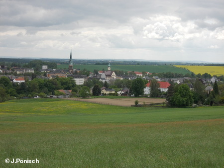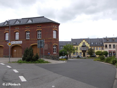 Unmittelbar danach biegen wir halblinks in die Dresdner Straße und biegen an deren Ende links in Richtung Kirche (Vorsicht: Einbahnstraße in Gegenrichtung). Wir fahren nun immer geradeaus ins Zentrum von