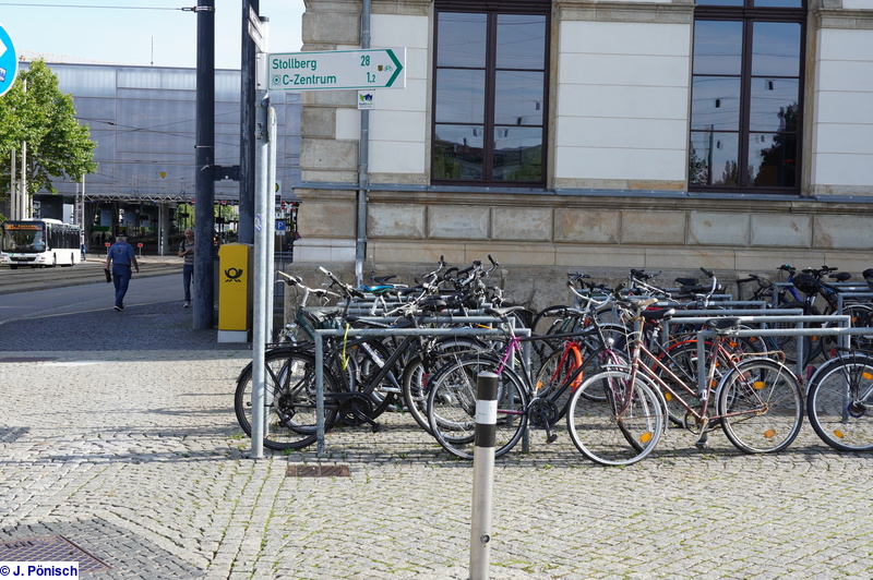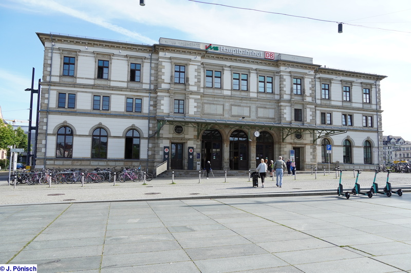 Vom Bahnhofsvorplatz fahren wir die Bahnhofstraße geradeaus in Richtung Zentrum (der Wegweiser zeigt fälschlich nach links). Spätestens an der nächsten Ampel wechseln wir besser auf die rechte Straßenseite. Nach 700 m biegen wir rechts in die Brückenstraße.