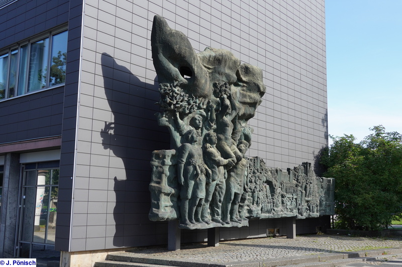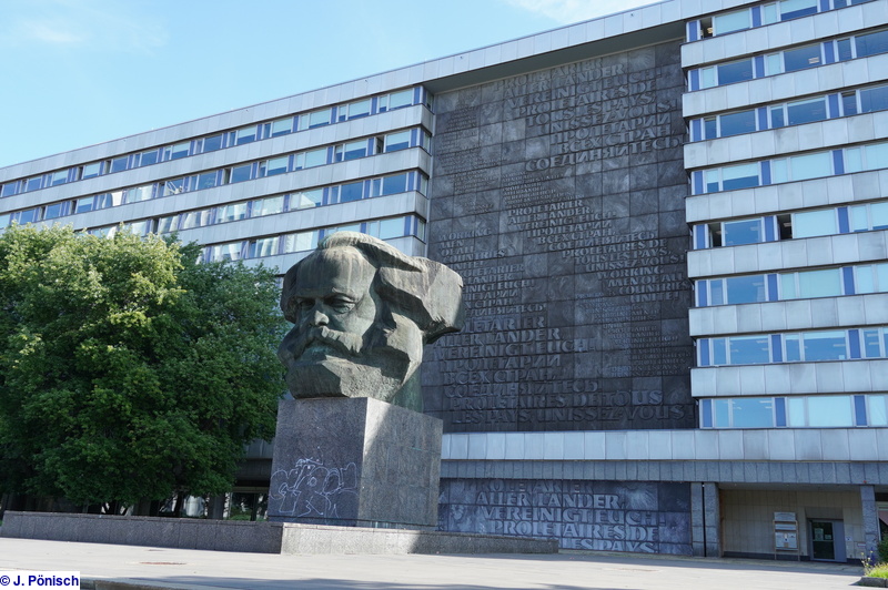 Vorbei am Karl-Marx-Monument geht es immer geradeaus bis zur Chemnitz, die wir auf einer Fußgängerbrücke überqueren.