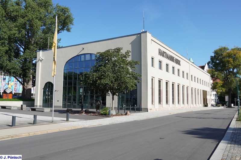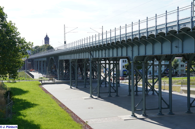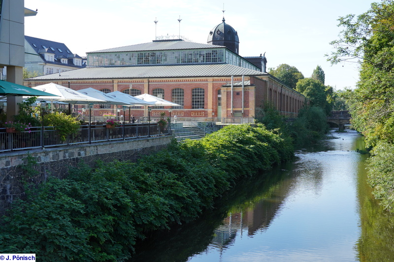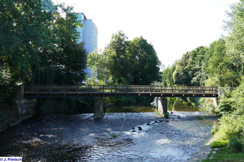 Danach biegen wir links in die Schloßstraße, kreuzen an einer Ampel die Hartmannstraße, passieren die Hartmann-Fabrik (Kulturhauptstadt-Information) und die alte Markthalle und fahren bis zur Holzbrücke des Pfortensteges. Die kurze Brücke über den Kappelbach wird überquert, vor der Brücke über die Chemnitz biegen wir aber rechts ab und fahren parallel zum Fluss bis zum