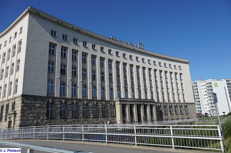 Wir überqueren die Ampel, fahren links des Flusses vorbei am Gebäude der Deutschen Bank und überqueren die nächste Brücke nach rechts in die Aue. Vorbei am Stadtarchiv und der Feuerwache erreichen wir nach 300 m die nächste Kreuzung. Wir fahren geradeaus in die Sackgasse Deubners Weg. In der nächsten Rechtskurve biegen wir links zur Reichsstraße und kurz davor links auf die Fußgängerbrücke ab.
