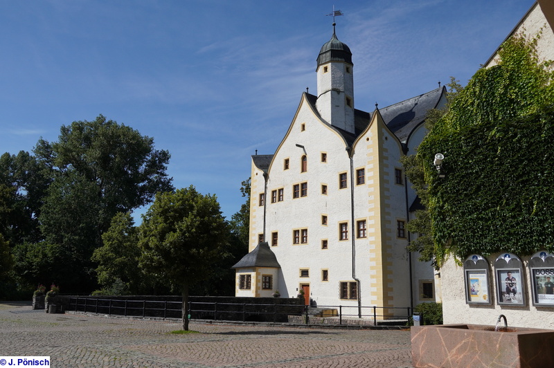 An der Einmündung biegen wir links in die Chemnitzer Straße. Diese mündet nach 300 m in die Würschnitztalstraße, der wir nach rechts folgen, die Bahn überqueren und sofort danach links in die Chemnitzer Straße biegen. Schon nach 200 m biegt rechts ein steil ansteigender Fußweg zum Wasserschloss ab, dem wir folgen müssen. Der schmale, etwas hügelige Pfad mündet nach 1 km in den Wasserschloßweg. Diesem folgen wir nach rechts, fahren immer rechts an der Schlossmauer entlang und erreichen an der Brücke den Schlosseingang.