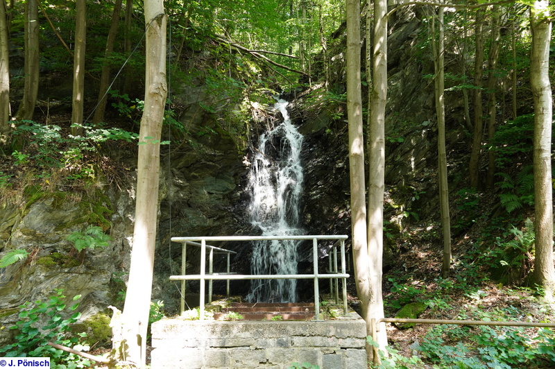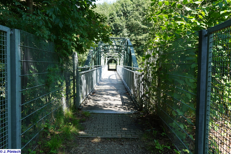Dann folgen wir der Hauptstraße weitere 700 m und biegen links in eine kleine Zufahrtsstraße ein, die uns um die Muldenschleife, vorbei an einem kleinen Wasserfall, führt. Wir erreichen ein Industriegelände und folgen hier weiter dem Radweg, der über eine alte Eisenbahnbrücke zum Bahnhof Schlema führt. Wir unterqueren Bahntrasse und sehen links den